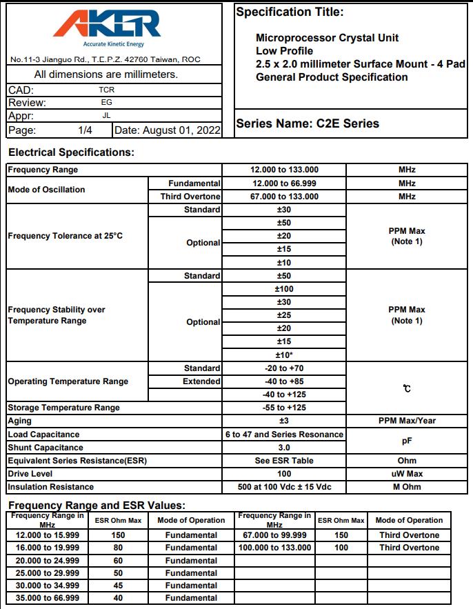 C2E-12.000-18-1020-X-R | Aker晶振 | C2E | 12 MHz | ±20ppm | ±10ppm | 18pF |