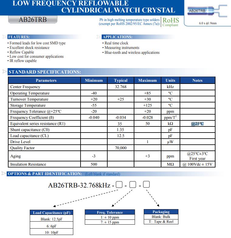 AB26TRB-32.768KHZ-T | Abracon晶振 | AB26TRB | 32.768kHz | ±20ppm | 12.5pF | -40°C ~ 85°C |