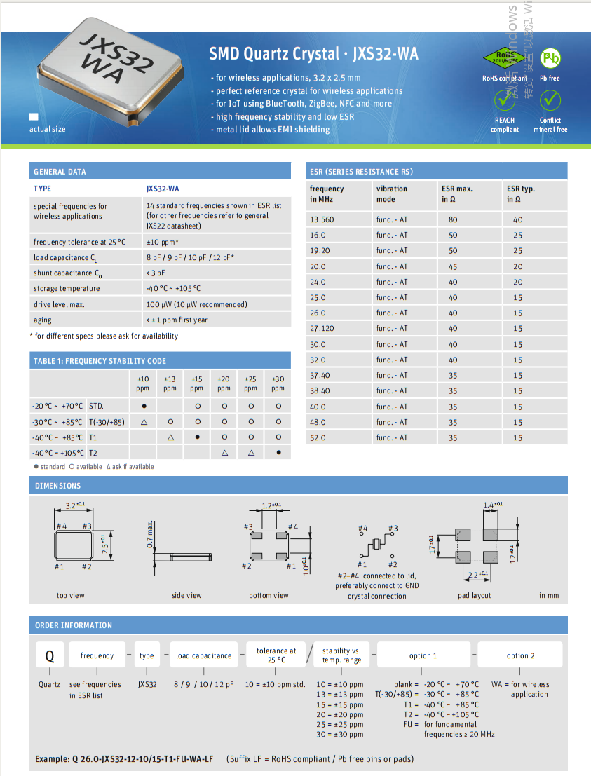 型號名稱 Modelname: JXS32網絡應用晶振 溫度OperatingTemperature -40 °C ~ +85 °C