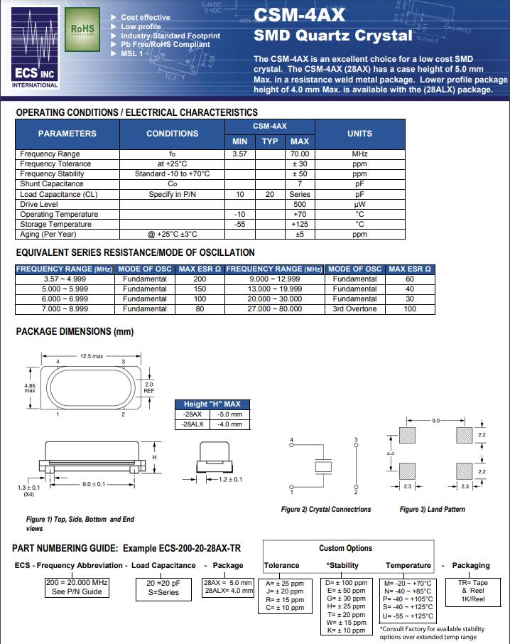ECS-40-20-28AX-TR | CSM-4AX | 4MHz | ±50ppm | ±30ppm | 20pF |