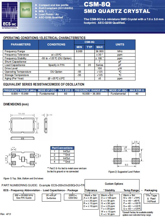 ECS-130-18-20BQ-DS | CSM-8Q | 13MHz | ±100ppm | ±30ppm | 18pF | -40°C ~ 125°C |