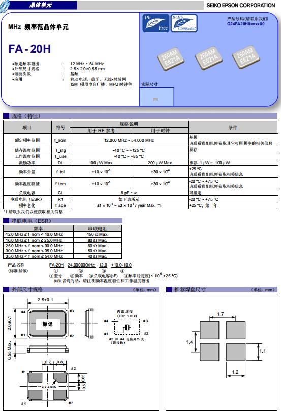 Q24FA20H00156 | 2.5 x 2 x 0.55mm | FA-20H | 24.000000 MHz | 7 pF | -20 to +75 °C |