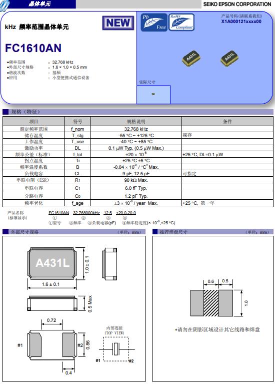 X1A000121000600|9pF|32.768KHz|1610mm|20ppm,X1A000121000600晶振,負載電容9pF,頻率32.768KHz,尺寸大小1610mm,精度20ppm,超小型封裝晶振,小型便攜式通訊設備晶振,兩腳貼片晶振,智能手機晶振,平板電腦晶振,數碼相機晶振.