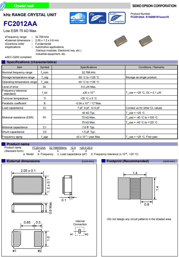 X1A000181000300 | 2.05 x 1.2 x 0.6 mm | FC2012AA | 32.768kHz | 7 pF | -40 to +125 °C |