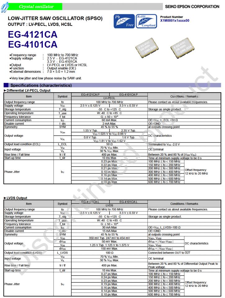 X1M0001410013 | EG-4101CA | 100.000000 MHz | 7.00 x 5.00 x 1.20 mm | LV-PECL | 2.970 to 3.630 V |