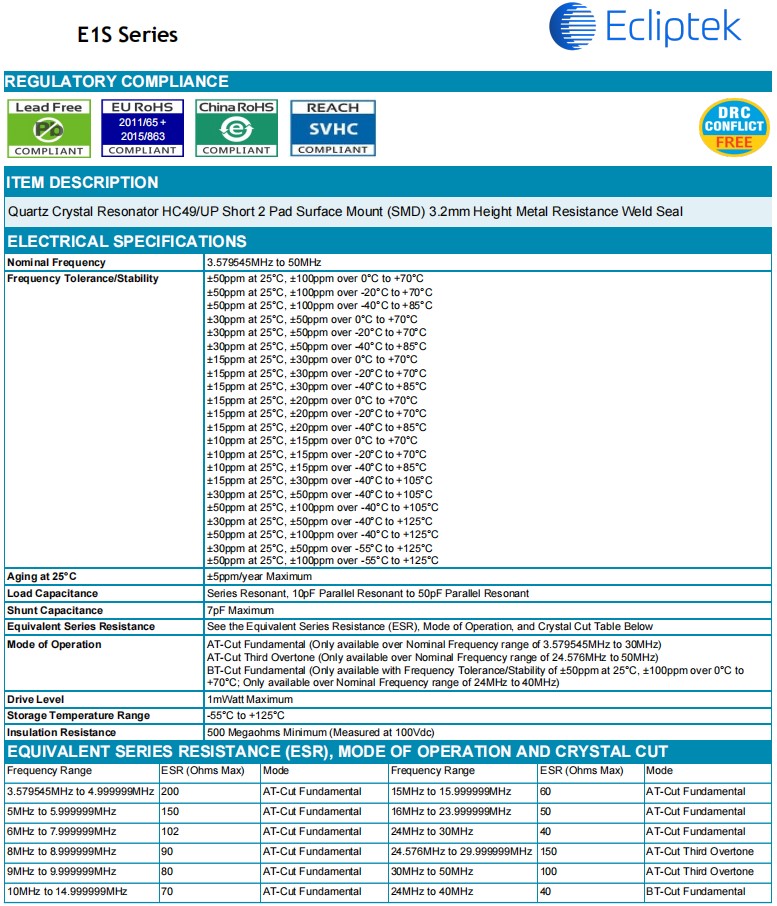 Ecliptek日蝕晶振E1S,E1SJA18-25.000M TR貼片晶振,E1SJA18-6.000M TR,無源晶振,參數(shù)圖
