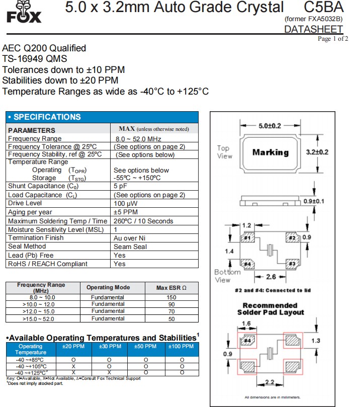 FC5BACBEI26.0-T1 | Fox 晶振 | C5BA | 26 MHz | ±50ppm | ±30ppm | 10pF |