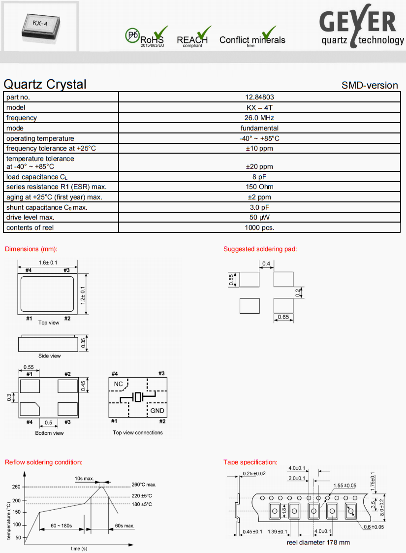 12.84803 | Geyer晶振 | KX-4 | 26 MHz | ±20ppm | ±10ppm | 8pF |