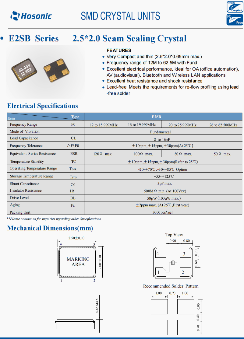 遙遙領先的航空航天晶振,臺產鴻星晶振,E2SB54E000000E晶振,臺產Hosonic晶振公司,無源晶振,四腳晶振,貼片晶振,石英晶振,鴻星晶振,臺灣晶振,2520晶振,6G室外基站晶振,航空航天晶振,空間站晶振,環保無鉛晶振,高精度晶振,北斗衛星定位模塊晶振,智能水表晶振,特點:非常緊湊和薄(2.5*2.0*0.65毫米最大)頻率范圍12M ~ 62.5M,具有優良的電氣性能,是OA(辦公自動化),AV(視聽),藍牙和無線局域網應用的理想選擇。優異的耐熱性和抗震性,無鉛。滿足使用無鉛焊料的回流剖面要求.