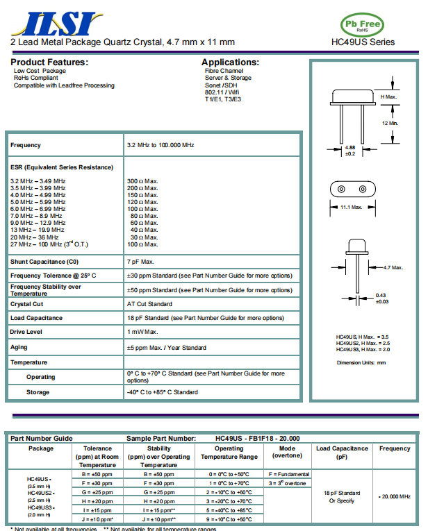 HC49US-FF5F18-20.0000 | ILSI 晶振 | 20MHz | ±30ppm | ±30ppm | 18pf |