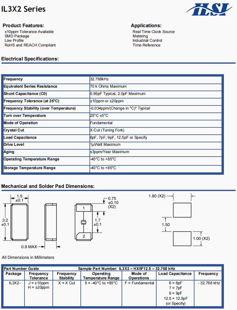 艾爾西音叉晶振,IL3X2二腳貼片晶振,IL3X2-HX5F9-32.768kHz無線路由器晶振,美國ILSI晶振公司,IL3X2晶振,IL3X2-HX5F9- 32.768 kHz晶振,特點(diǎn):SMD音叉晶體諧振器,公差:±20ppm,±10ppm可用,工作溫度-40~85°C,高品質(zhì)晶振,進(jìn)口晶振,艾爾西晶振,進(jìn)口晶振,貼片晶振,3215晶振,智能手機(jī)晶振,移動通信終端晶振,基準(zhǔn)時鐘晶振,無線通信晶振,貼片晶振,WIFI用晶體,二腳晶振,歐美晶振,無源晶振,無人機(jī)晶振,電車充電槍晶振,石英晶體諧振器網(wǎng)絡(luò)服務(wù)器晶振,存儲卡晶振,無線局域網(wǎng)晶振,光纖通道晶振.