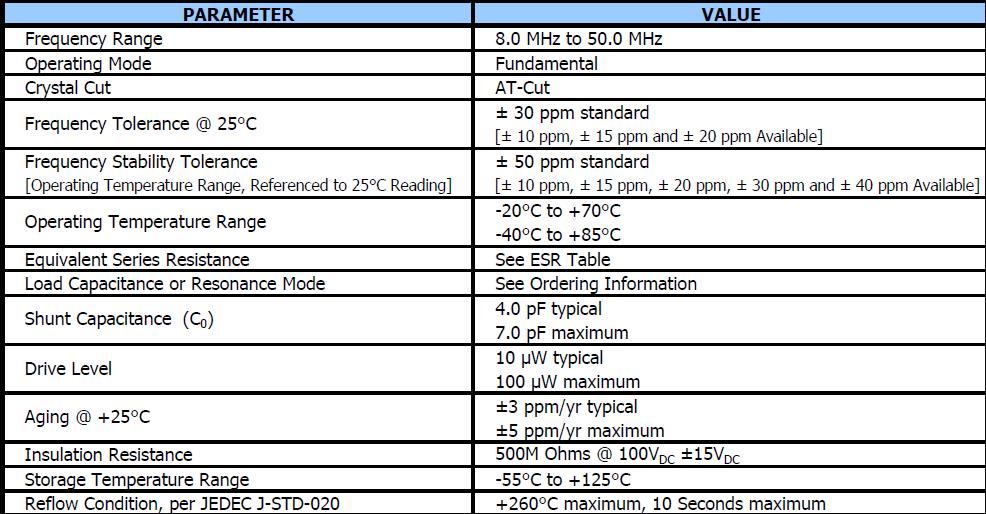 頻率范圍8~50 MHz,頻率公差,±30 ppm標準(其他公差),頻率穩定度,±50 ppm標準,(其他穩定性),操作溫度為-40°C + 85°C,穩定溫度和驅動頻率水平,磁帶和卷軸包裝標準,eia - 481,符合RoHS /綠(6/6)