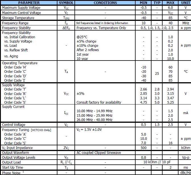 頻率范圍10 - 40 MHz(標準頻率列表所示),基本晶體設計,頻率穩定度,幾個選項可供選擇±0.5 ppm ~±2.5 ppm,操作電壓,+ 2.8 vdc ~ + 5.0伏直流,操作溫度為-40°C + 85°C,磁帶和卷軸包裝,eia - 418,符合RoHS /綠(6/6).