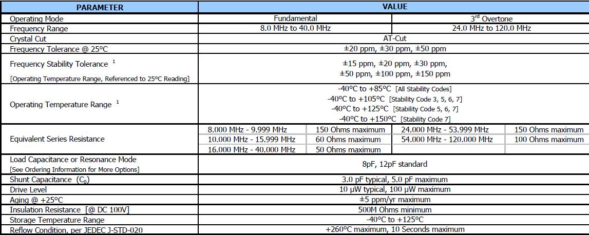 標(biāo)準(zhǔn)5.0毫米x 3.2毫米玻璃密封包,基本晶體設(shè)計(jì),頻率范圍8 - 40 MHz基本,24 - 120 MHz第三泛音,頻率公差;±20 ppm,±30 ppm和±50 ppm,頻率穩(wěn)定度,參考訂購信息,操作溫度,-40°C + 125°C標(biāo)準(zhǔn),磁帶和卷軸包裝標(biāo)準(zhǔn),eia - 481,通過無鉛認(rèn)證符合歐盟指令2011/65 /歐盟,無鉛終止完成,豁免7(c)-我,電氣和電子元件含鉛玻璃(Pb).