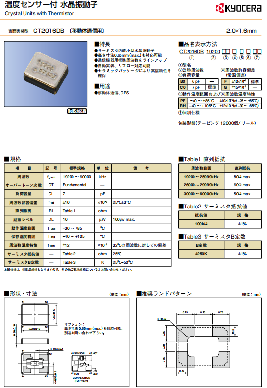 CT2016DB19200C0FLHA1 | AVX 晶振/Kyocera 晶振 | CT2016DB | 19.2MHz | -30°C~85°C |
