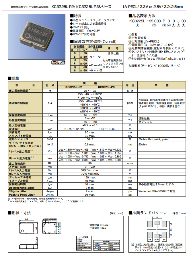 KC3225A125.000C30E00 | AVX Corp/Kyocera Corp | KC3225A-C3, Kyocera | 125MHz | 3.3V | -10°C ~ 70°C |