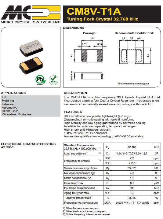 CM8V-T1A-32.768kHz-9pF-20PPM-TA-QC,2012mm,Micro音叉晶體諧振器,歐美進口晶振,CM8V-T1A-32.768kHz-9pF-20PPM-TA-QC晶振,2012mm晶振,Micro音叉晶體諧振器,超小型晶振,32.768KHz晶振,負載9pf,高精度晶振,抗沖擊晶振,兩腳貼片晶振,物聯網晶振,計量儀器晶振,汽車電子晶振,筆記本電腦晶振,手持設備晶振.