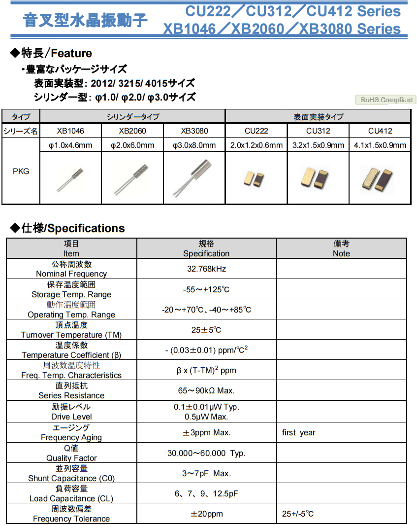 CU412 32.768KHz晶振,日本納卡環保晶體,6G室外基站晶振,納卡晶振公司,日本晶振,NAKA晶振,進口晶振,32.768K晶振,二腳晶振,石英晶振,貼片晶振,無源晶振,CU412晶振,圓柱晶振,6G物聯網晶振,智能手表晶振,通訊設備晶振,超小型晶振,電腦主板晶振,無人機晶振,宇宙飛行器晶振,無人機晶振。特點:使用范圍廣,豐富的包裝尺寸,表面安裝類型:2012/ 3215/ 4015尺寸,圓柱型:φ1.0/ φ2.0/ φ3.0尺寸。