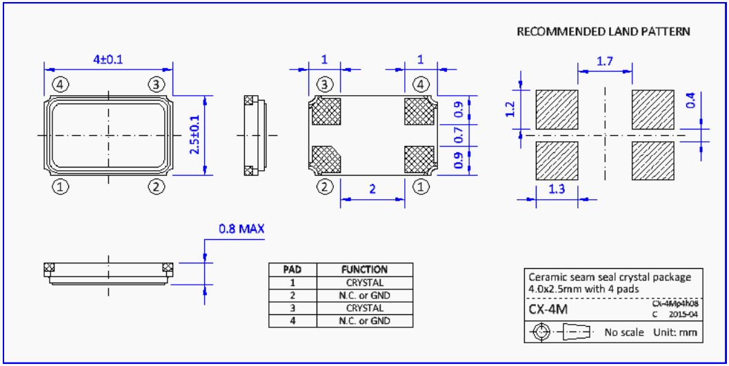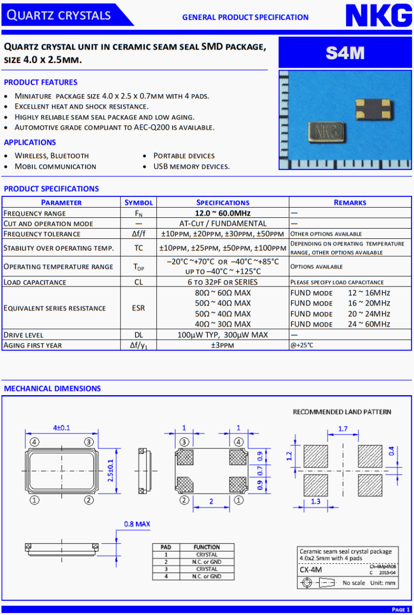 NKG進口晶體,S4M25.0000F18E23-EXT環保晶振,車載收音機晶振。NKG晶振公司,無線傳輸晶振,汽車藍牙晶振,移動通訊晶振,便攜設備晶振,USB存儲設備晶振。4025晶振,小體積晶振,超薄晶振,貼片晶振,進口晶振,石英晶振,高品質晶振低損耗晶振,汽車級晶振,車載音響系統晶振。石英晶體單元在陶瓷縫密封SMD封裝,尺寸4.0 x 2.5mm。S4M。產品特點:微型包裝尺寸為4.0 x 2.5 x 0.7mm,帶有4個襯墊。優異的耐熱性和抗震性。高可靠的縫封封裝,低老化。符合AEC-Q200標準的汽車級產品可供選擇。
