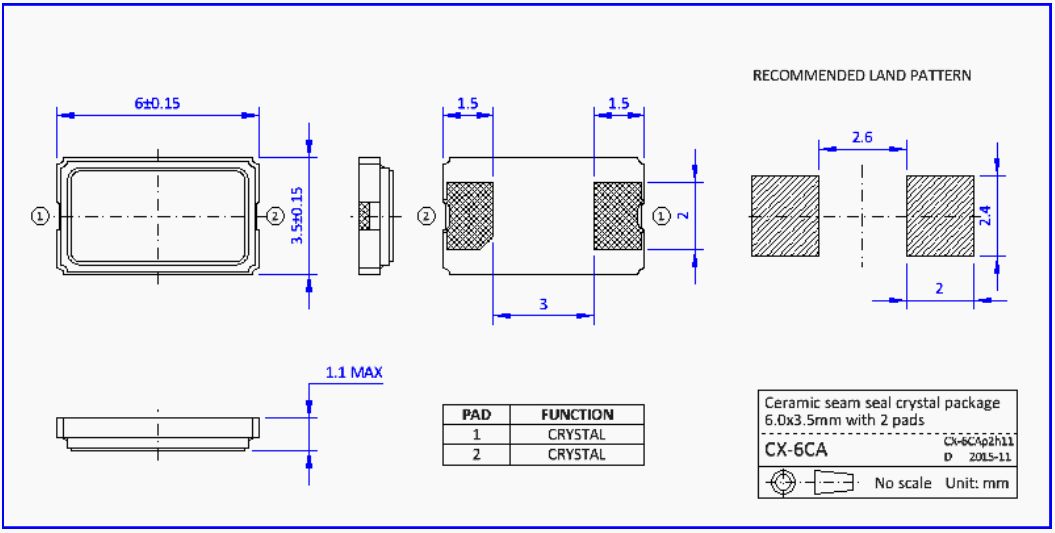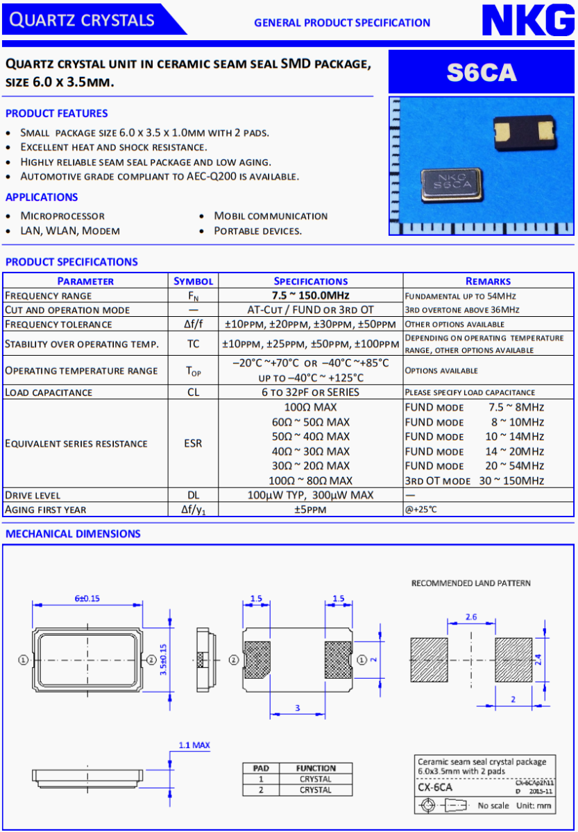NKG二腳晶振,智能穿戴設備晶振,S6CA128.8800F18EYY-EXT四腳晶振。NKG晶振公司,無線傳輸晶振,汽車藍牙晶振,移動通訊晶振,石英晶振,高品質晶振,低損耗晶振,汽車級晶振,車載音響系統晶振,便攜設備晶振,USB存儲設備晶振。6035晶振,小體積晶振,超薄晶振,貼片晶振,進口晶振,石英晶體單元在陶瓷縫密封SMD封裝,尺寸6.0 x 3.5mm。S6CA。產品特點:小包裝尺寸6.0 x 3.5 x 1.0mm與2個墊。優異的耐熱性和抗震性。高可靠的縫封封裝,低老化。符合AEC-Q200標準的汽車級產品可供選擇。應用:微處理器,局域網,無線局域網,調制解調器,移動通信,便攜式設備。
