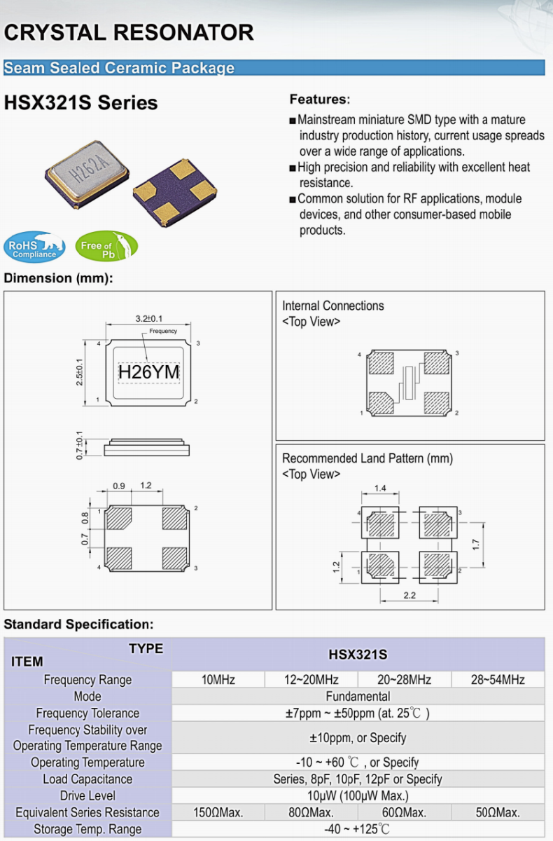 X3S013000BA1H-V | 加高晶振 | HSX321S | 13 MHz | ±10ppm | 10pF | -10°C ~ 60°C |