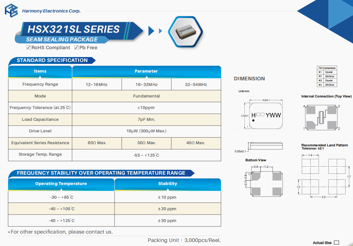 X3S032000LK1H-Z | 加高晶振 | HSX321S | 32 MHz | ±12ppm | 20pF | -30°C ~ 85°C |