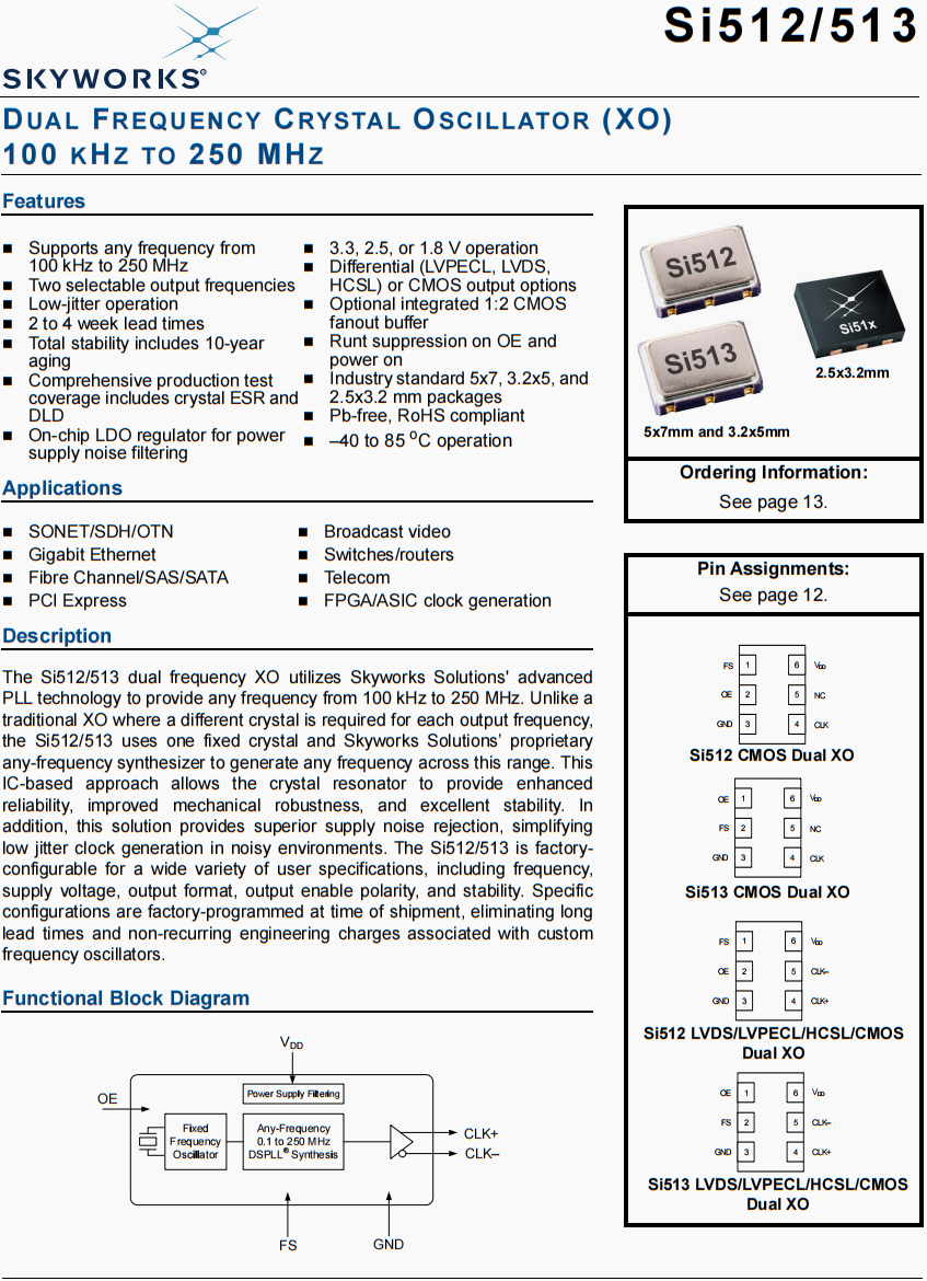513BBA125M000AAG | Skyworks晶振 | Si513 | XO | 125 MHz | LVDS | 3.3V | ±25ppm |