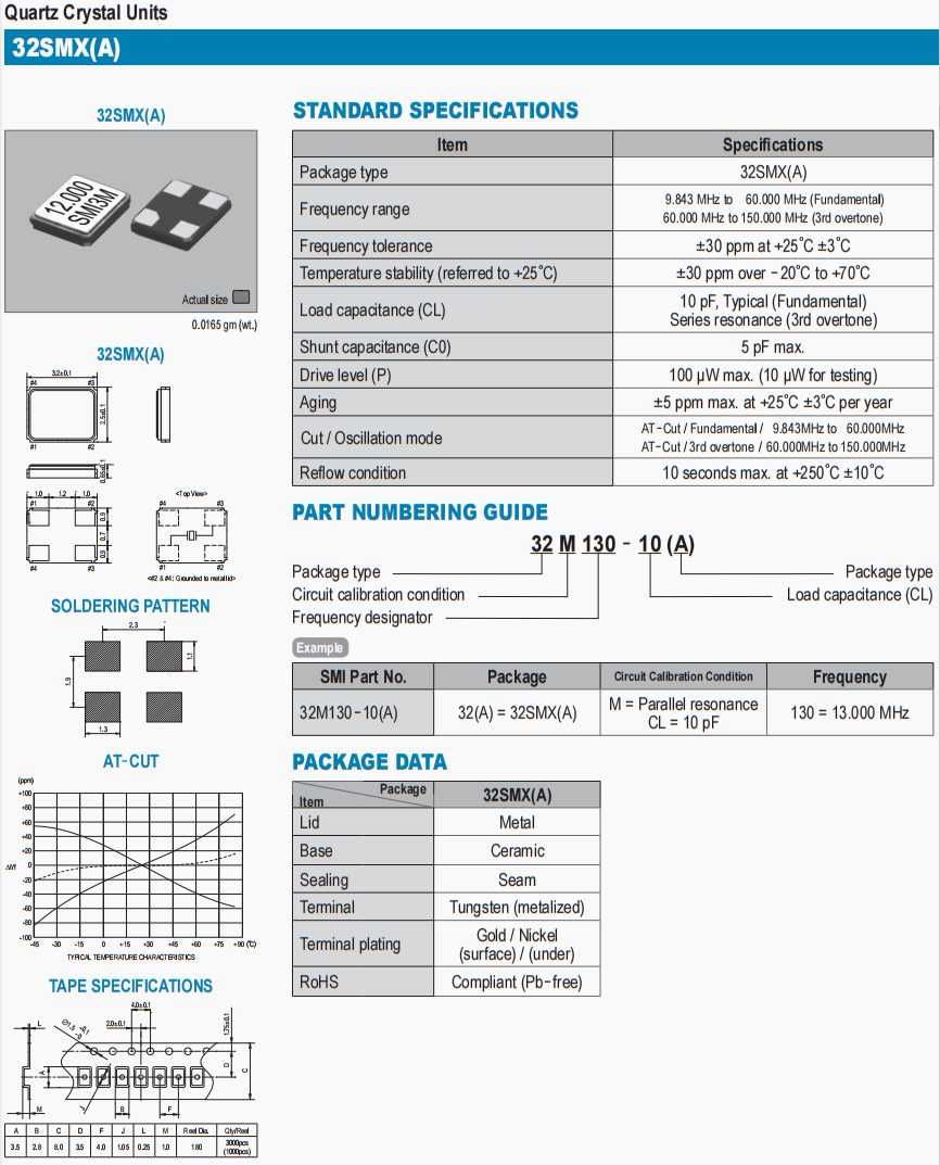AT-Cut / Fundamental / 9.843MHz to 60.000MHz AT-Cut / 3rd overtone / 60.000MHz to 150.000MHz |