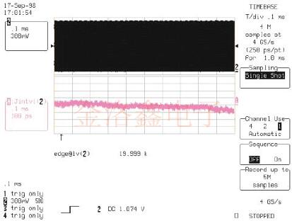 圖1顯示了使用時間間隔誤差(Jintvl)的JitterTrack來表征20MHz振蕩器在1ms測量窗口內的穩定性.該Cardinal溫補振蕩器非常穩定,在測量窗口范圍內,我們正在測量低于100ps理想周期的誤差.換句話說,振蕩器的相位正在漂移.時間間隔誤差實質上是測量輸入信號的相位誤差.頻率或周期的抖動跟蹤更適合于測量在整個測量間隔內頻率發生變化的振蕩器.