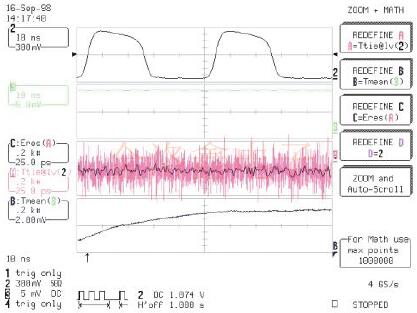 圖3說明了這種類型的測量.下部跡線是包含振蕩器的外殼內溫度的趨勢圖.校準溫度探頭以每攝氏度產生1mV.跡線A是水平上的時間間隔誤差趨勢.軌跡A的平滑版本疊加在其頂部,以顯示時間間隔錯誤的主題變化.所有這些趨勢圖都包含2000個測量值.觸發釋抑用于每秒進行一次測量.趨勢包含2000秒的數據,顯示石英晶體振蕩器的預熱.時間間隔誤差的趨勢表明溫度變化約8攝氏度時峰峰值變化約為+/-100ps.請注意,溫度與時間間隔誤差之間沒有明顯的關系.這些測量結果表明力科JTA封裝的測量和分析能力如何,以長記憶為輔,可用于表征振蕩器的長期,短期和環境穩定性.