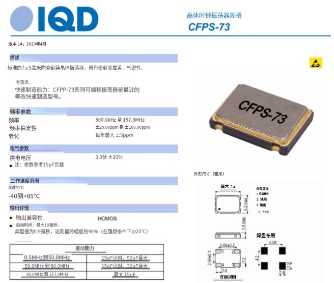 LFSPXO018041REEL | IQD 進口晶振 | CFPS-73 | XO (Standard) | 4 MHz | HCMOS | 3.3V | ±50ppm |