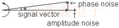 剛開始時,相位噪聲可能看起來有些神秘,但是熟悉"普通"噪聲和"普通"功率譜密度的任何工程師都可以很快地提高速度,石英晶體振蕩器的輸出可以由相量圖表示. 該信號由一個向量表示,該向量的長度與信號幅度成正比,該幅度圍繞振蕩器的頻率圍繞原點旋轉,這個矢量的頂端是一個隨機的,指向振蕩器的噪聲的小矢量.該噪聲矢量可以由兩個正交矢量表示,一個正交指向信號矢量的方向,一個正交指向旋轉的方向.振幅矢量是熟悉的振幅噪聲,另一個矢量是相位噪聲矢量.顯然,當振幅矢量改變時,振蕩器的整體振幅改變,而當相位噪聲矢量改變時,振蕩器的相位改變,盡管將幅度抖動與總幅度進行比較很直觀,將弧度的相位抖動與載波的幅度進行比較似乎是任意的,這兩個量似乎無關.困惑在于小角度假設的腳,該假設指出小角度的正弦等于該角度.