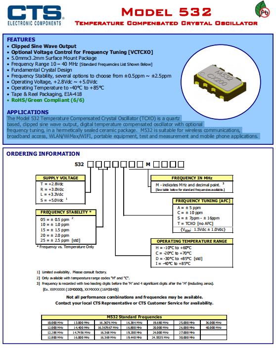 532L25DT26M0000 | CTS溫補(bǔ)晶振 | 532 | 26MHz | ±2.5ppm |