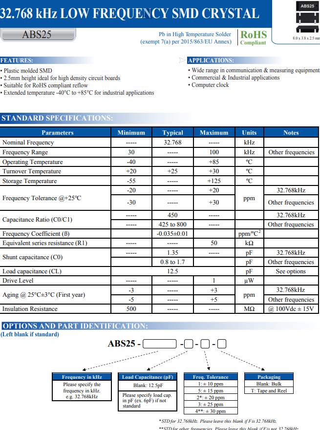 計算機時鐘小尺寸的32.768K無源晶體ABS25-32.768KHZ-4-T,適合計算機時鐘