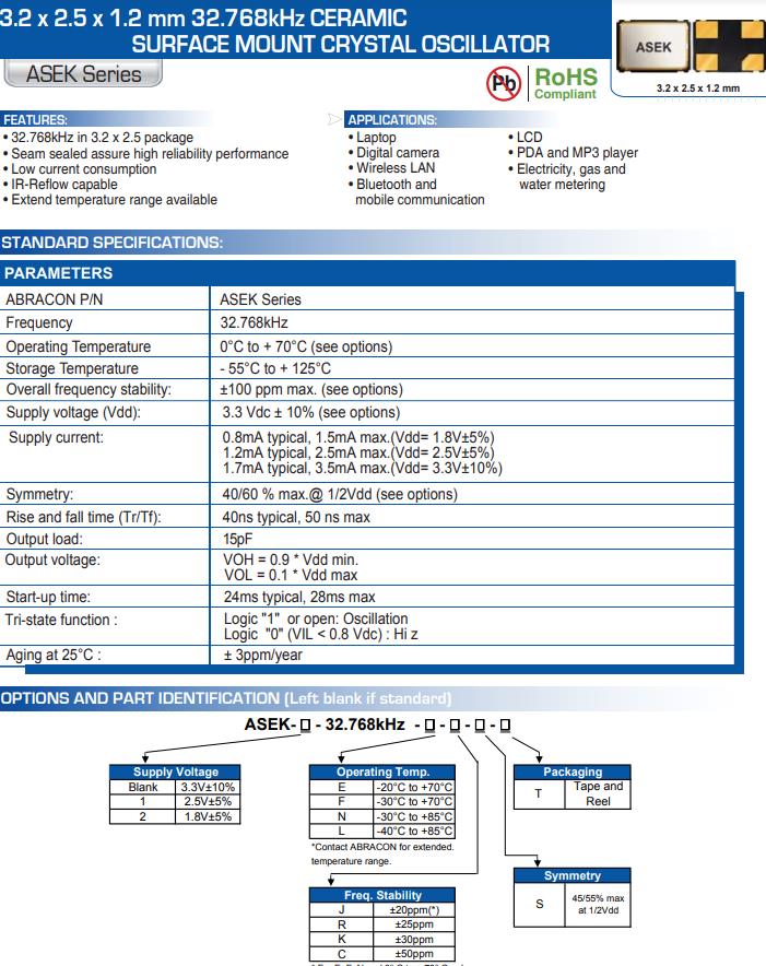 ASEK2-32.768KHZ-LRT | Abracon晶振 | ASEK | XO (Standard) | 32.768kHz | 1.8V | -40°C ~ 85°C |