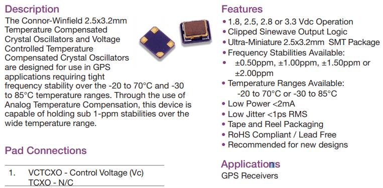 Connor-Winfield公司專為GPS接收器開發出穩定性能和低功耗的TCXO,C31-020.0M,Connor-Winfield 2.5 x3.2mm溫度補償晶體振蕩器和電壓控制溫度補償晶體振蕩器是為GPS設計的嗎?