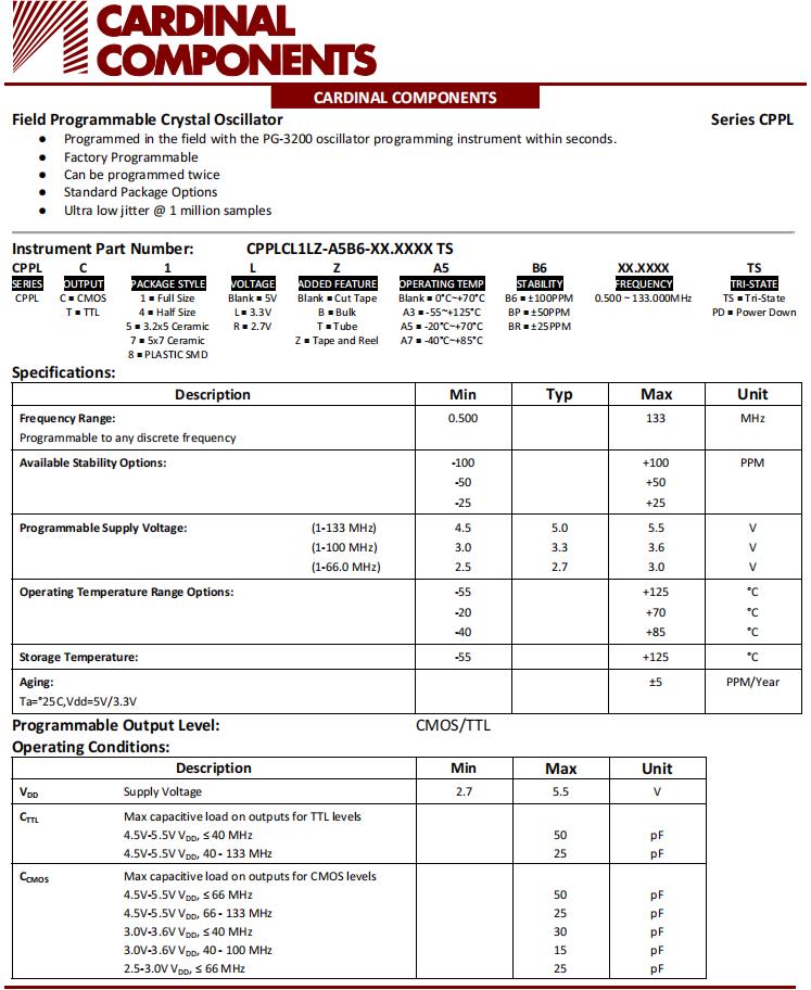 CPPC7-B6-5.0TS | Cardinal晶振 | OSC XO 5.000MHZ CMOS SMD | XO (Standard) | 5MHz | CMOS | ±100ppm | 0°C ~ 70°C |
