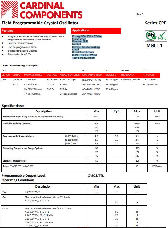 數字視頻最愛用到的時鐘振蕩器CPPC7L-A7B6-16.0PD,應用:驅動A/D, D/A, fpga,數字視頻,對以太網,GbE,醫療,存儲區域組網,COTS,寬帶接入,Sonet / sdh / DWDM,測試與測量.
