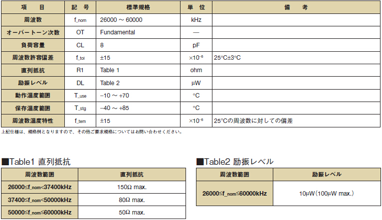 周波數 f _nom 24, 26, 32, 37.4, 38.4, 40, 48 MHz その他周波數についてはお問い合わせ下さい。