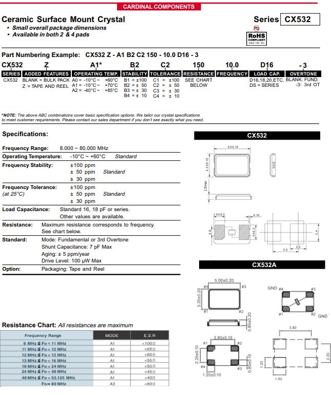 CX532Z-A5B3C5-70-18.432D18 | Cardinal晶體 | CRYSTAL 18.4320MHZ 18PF SMD | CX532 | 18.432MHz | ±30ppm | 70 Ohm | -20°C ~ 70°C |