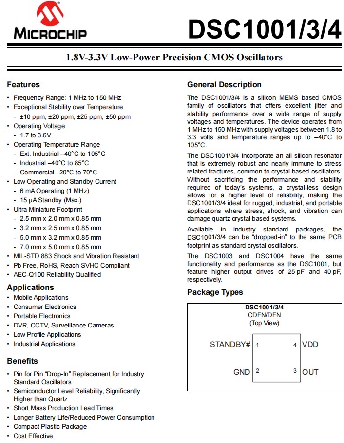 DSC1001CI2-018.4320 | Microchip晶振 | DSC1001 | 18.432MHz | 1.8 V ~ 3.3 V |