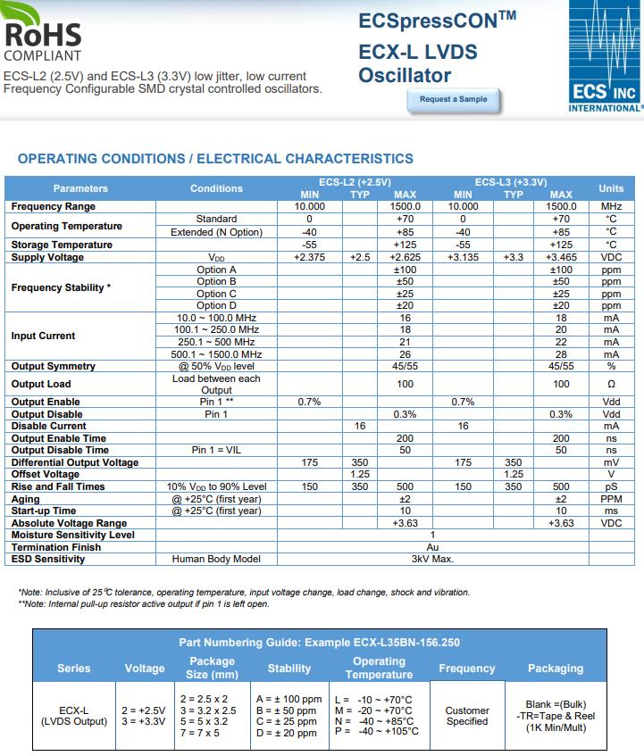 ECX-L33BN-250.000 | ECS差分晶振 | ECSpressCON™ ECX-L | 250MHz | -40°C ~ 85°C |