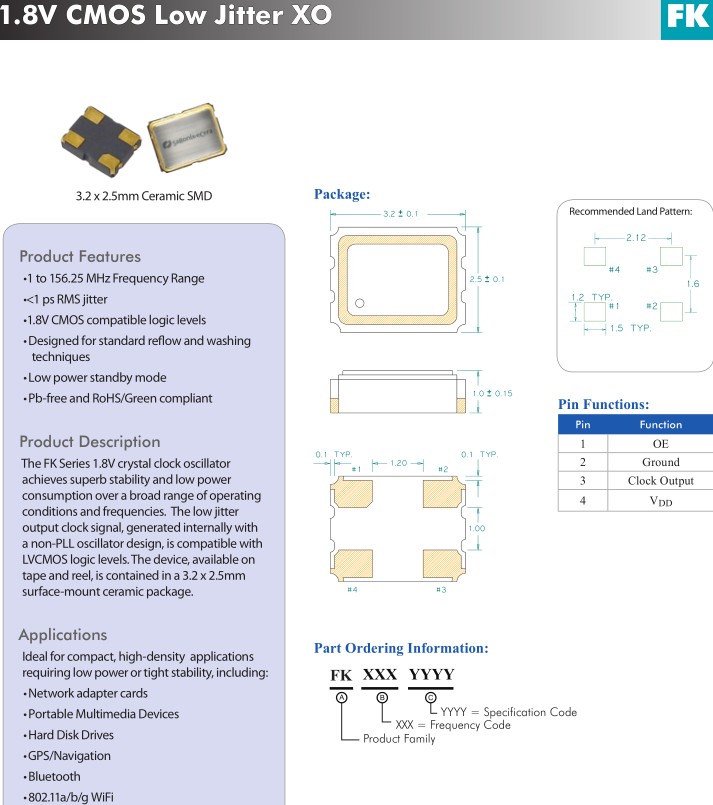 FK系列1.8V晶體時鐘振蕩器實現極好的穩定性和低功率消費范圍廣,經營范圍廣條件和頻率。低抖動輸出時鐘信號,內部產生非鎖相環振蕩器的設計,是兼容的LVCMOS邏輯水平的SPXO振蕩器。該設備,可用于磁帶和卷軸,包含在一個3.2 x 2.5mm陶瓷表面包。