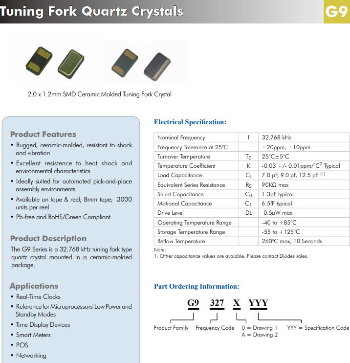 G9系列為32.768 kHz音叉型石英晶體安裝在陶瓷模塑包中。