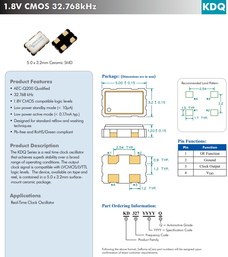 KDQ 1.8V 20~50 3.2x2.5 CMOS 1.8 4 1.8V、5.0x3.2mm、32.768kHz、汽車級CMOS晶體振蕩器