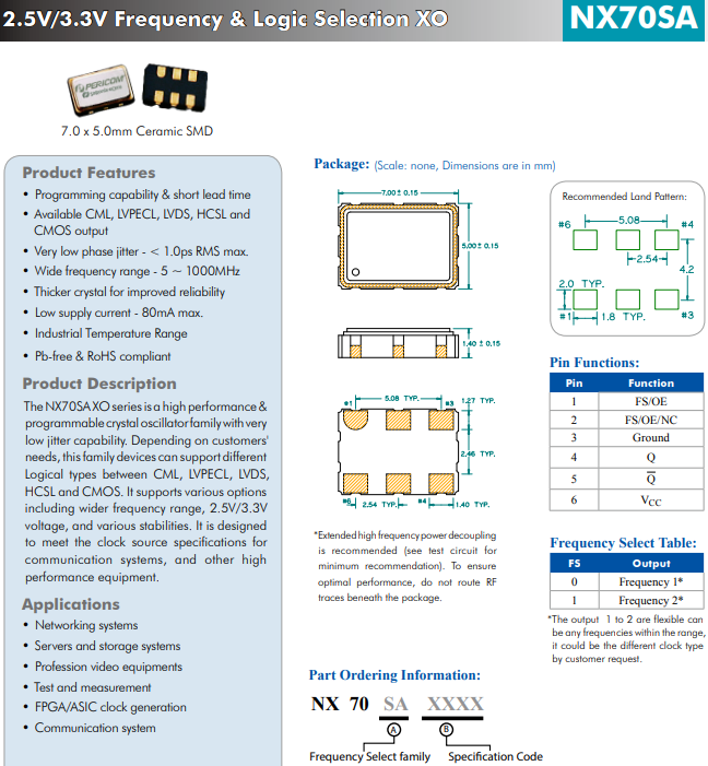 NX72SA | LVPECL差分晶振 | 3.32.5 | 5 到 1000 | <1 | 7.0 x 5.0 x 2.0 | 6 | 7.0mmx5.0mm LVPECL 2頻可編程XO | |