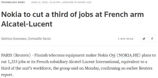 這次諾基亞一次性裁員1000多人,也會(huì)間接給供應(yīng)鏈造成一定的影響,業(yè)務(wù)量減少訂單同樣也會(huì)變少.諾基亞這一裁員聲明公布于各國積極部署5G移動(dòng)網(wǎng)絡(luò)之際,與此同時(shí),這則聲明在疫情發(fā)展未見明朗的法國引發(fā)了一定程度的政治反響,因?yàn)橹Z基亞在5年前買下Alcatel-Lucent時(shí),曾承諾保留工作崗位.據(jù)悉,承諾保留工作崗位這一條件加速了法國監(jiān)管機(jī)構(gòu)對(duì)該項(xiàng)收購交易的審批.
