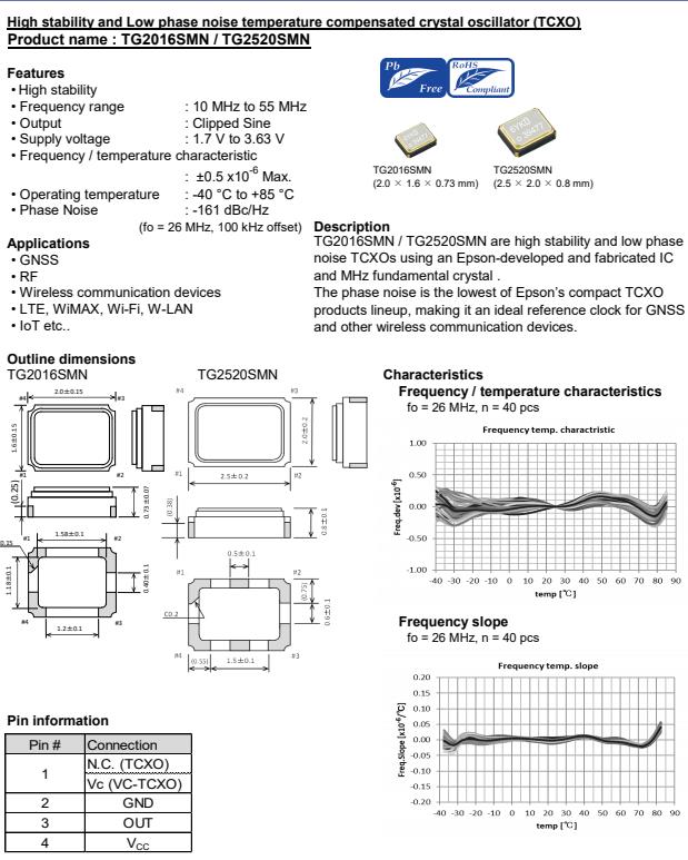 X1G005421020427 | TG2520SMN | 26.000000 MHz | 2.50 x 2.00 x 0.80 mm | 1.700 to 1.900 V | +/-1.5 ppm | -40 to +85 °C | +/-0.50 ppm |