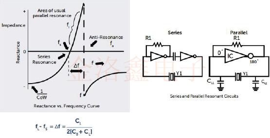 晶體的電抗曲線揭示了發生機械共振的位置.串聯諧振發生在曲線過零的點.在這一點上,晶體似乎是一個被電容分流的簡單電阻.通過在晶體上串聯或并聯增加電容[負載],會發生并聯諧振,從而導致正頻移.
