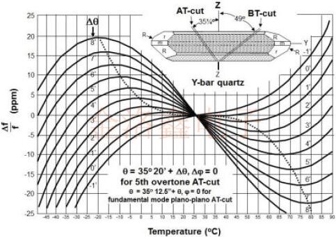 可以選擇三個不同的角度來優化不同范圍內的性能.較低的角度可用于-20℃~+70℃的溫度范圍,應選擇較大的角度以適用于較寬的溫度范圍.在給定的溫度范圍內,在更嚴格的公差(較小的ppm偏移)范圍內的性能受到曲線本身以及角度切割精度的限制.好的切割精度可以低至1至2分鐘,而測量精度則可以精確至0.1分鐘.與該過程有關的擴散和為3分鐘以上的時間增加的成本增加了成本.曲線允許對溫度范圍的公差進行理論限制.注意不要指定不可能的情況.